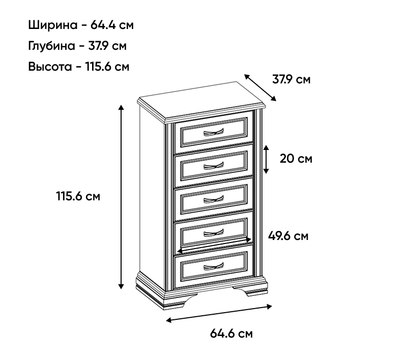 Комод состоит из пяти вместительных ящиков для хранения необходимых вещей. Несмотря на компактный внешний вид, комод очень вместителен внутри.