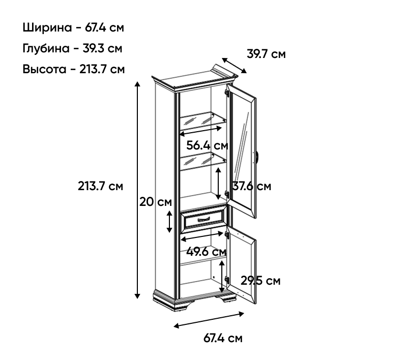 Верхняя часть витрины имеет стеклянную дверцу, за которой расположены просторные полки. Они идеально подходят для демонстрации вашей посуды, коллекционных предметов, книг или декоративных аксессуаров. Прозрачность стекла позволяет легко находить нужные вещи, а также защитить их от пыли и внешнего воздействия.
