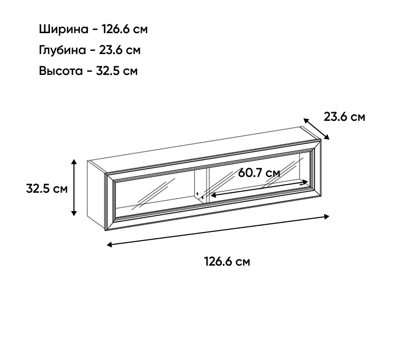 Полка состоит из откидной стеклянной дверцы и двух вместительных отсеков. Внутри вы сможете расположить книги, предметы коллекций или посуду. Верхняя поверхность полки также может послужить местом для расположения ваз, фоторамок и других элементов декора.