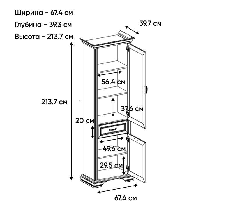 Шкаф визуально поделён на три секции: сверху располагаются две полки, скрытые за распашной дверцей, посередине — выдвижной ящик, а снизу — полка за ещё одной дверцей. Ящик установлен на шариковые направляющие, что гарантирует бесшумное открытие и закрытие. Полки и выдвижной ящик выдерживают вес до 5 кг.