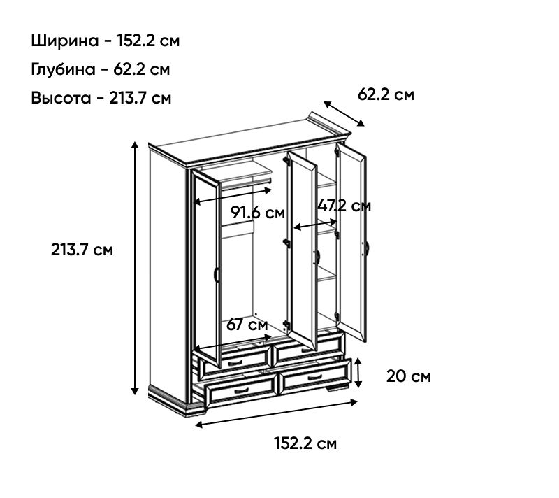 В нижней части шкафа находятся четыре вместительных выдвижных ящика, которые обеспечивают дополнительное место для хранения белья, носков, аксессуаров и других мелких предметов. Ящики оснащены шариковыми направляющими, что гарантирует их бесшумное и легкое выдвижение.